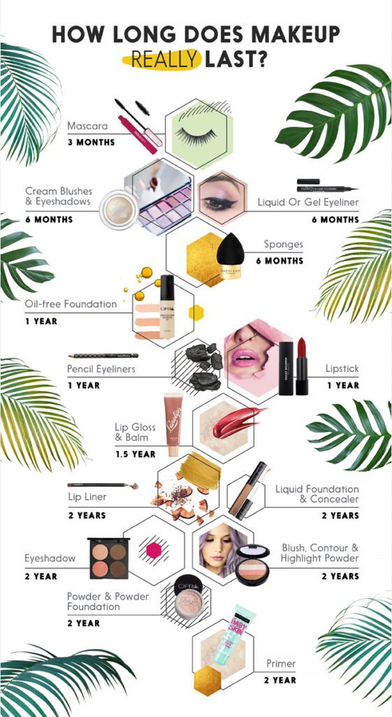 While you may be tempted to keep your favorite mascara or foundation around even if it’s getting old, check sure the makeup you’re using isn’t past its expiration date. It’s important to just keep makeup for the amount of time specified on the product’s container. The following makeup shelf life guidelines are helpful to know too: