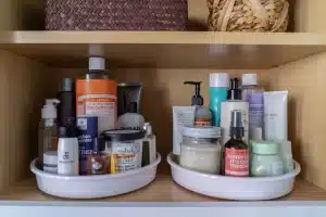 Use tension rods to create vertical dividers for spray bottles. Install a turntable – or use a Lazy Susan– for easy access to products in the back. For hot tools, mount heat-resistant pouches to the inside of cabinet doors.