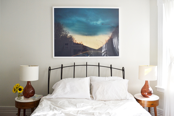 Whether you choose a sculpture, photograph, or colorful painting adding a piece of statement art to your bedroom can have a huge design impact. While your statement piece can certainly be displayed on the wall, leaning against a wall can be just as powerful.