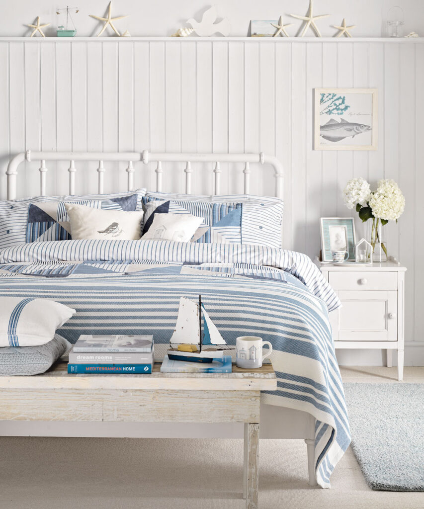 Nothing says summer quite like a coastal scheme, so if your bedroom’s looking dark and gloomy, why not consider a nautical refresher? This theme calls for a lot of bright white and coastal blue, so go for whitewashed walls or paneling with bare wooden floorboards and ticking stripes, chambray, and nautical prints. Display favorite artwork, coastal postcards, and beachcombing finds on a floating shelf.