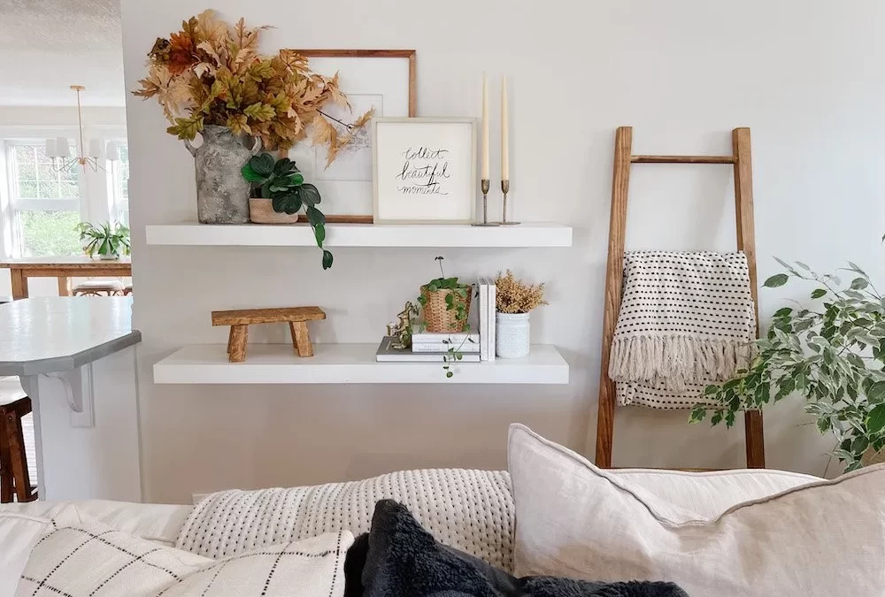 If you have open shelving, consider them your canvas for seasonal changes. A few well-placed autumnal items among your books or dishes can make a big impact. To keep things looking organized, try to keep a consistent spacing between items and stick to your simple color palette.