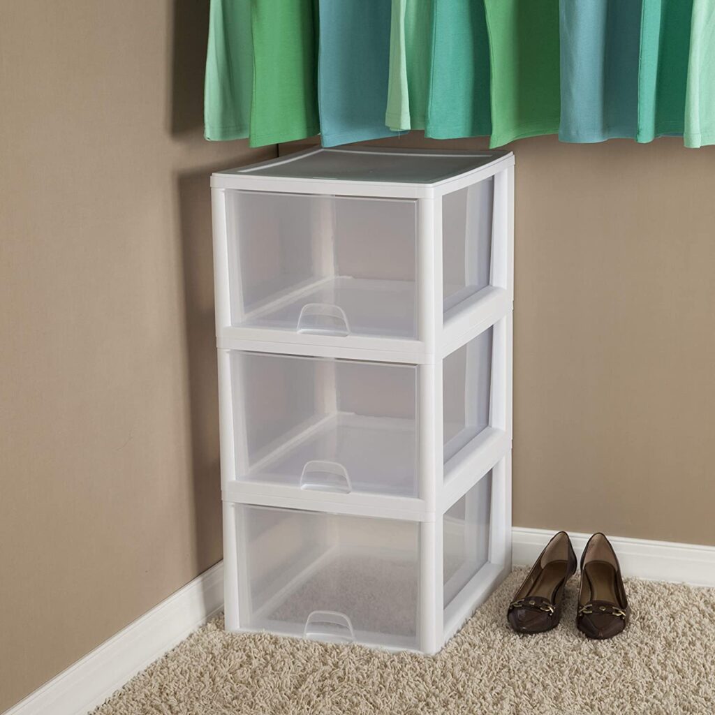 To help them stay organized, and be able to find what they are looking for when rushing to class, clear plastic drawers are often the best choice, especially as decor issues won’t be a problem once the closet door is closed.