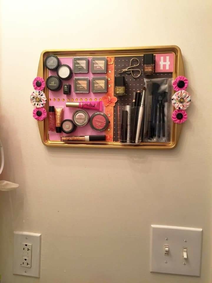 Create a vertical storage solution that doubles as wall art. A magnetic board with small, strong magnets can hold metal makeup pans and tools.