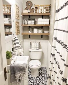 - Wall-Mounted Shelves: Install floating shelves above the toilet or next to the sink for additional storage space for decorative items, extra towels, or toilet paper rolls, keeping surfaces clutter-free.