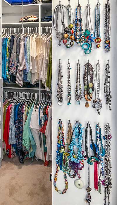 Hooks are also great for adding to the back of a closet door to hang your everyday wear jewelry – no more wasting time trying to untangle that string of beads (again) when you really should have been out of the door ten minutes ago.