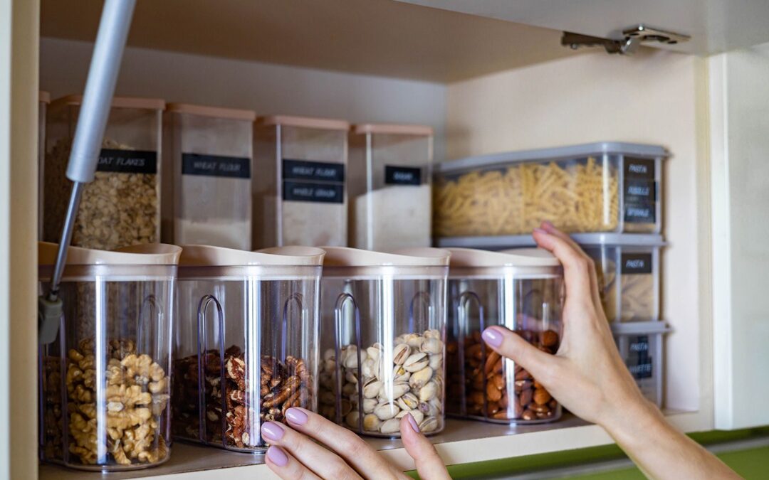Opt for clear, airtight containers for dry goods like grains, pasta, and cereals. They keep food fresh, allow you to see what’s inside, and create a neat, uniform look in your pantry. Use baskets or bins to group smaller items together, and make sure your chosen containers fit well on your shelves and are appropriate for your items.