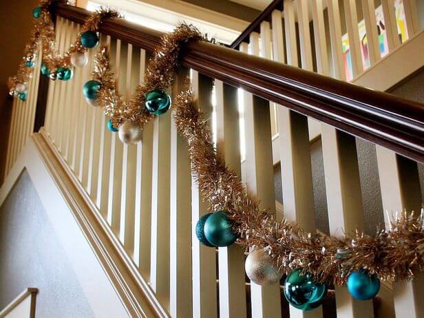 Hung on a banister, tinsel brings drama to a staircase. Use Christmas ribbon in a color that complements your holiday decor to fasten the tinsel at evenly spaced points along the banister top, allowing swags of tinsel to dip between the points. For a richer look, twist or braid two or more strands together.